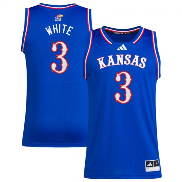 • Official Jersey: Men Tre White Royal Kansas Jayhawks #3 College Basketball 2025 Jersey